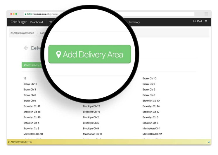 Your delivery areas are zones that you will deliver to, based on your location. Predefine them in Sapaad under Setup > Location Setup > Delivery Settings > Delivery Areas.