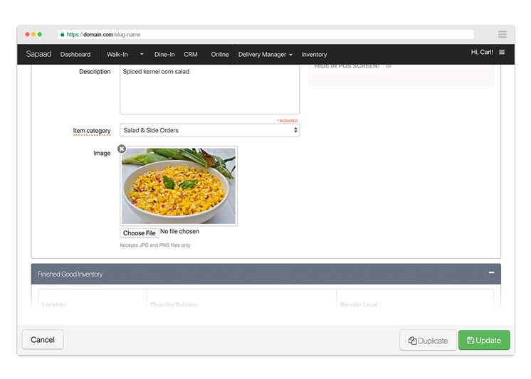 You can add awesome styled images of your menu items by editing them under Setup > Menu Setup. The recommended image specs are 800 x 800 pixels in .JPEG or .PNG, and the maximum file size is 6 MB. Click here to read more about the recommended image specifications.